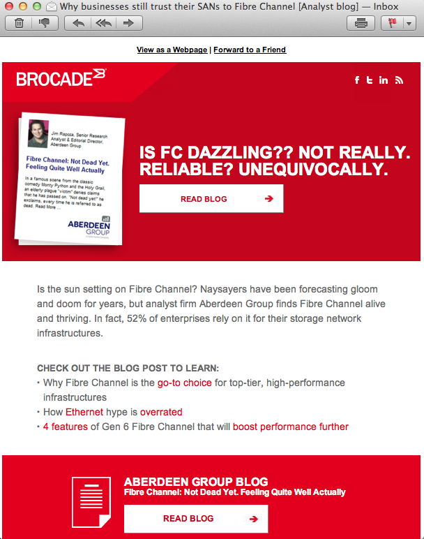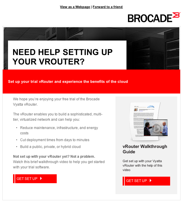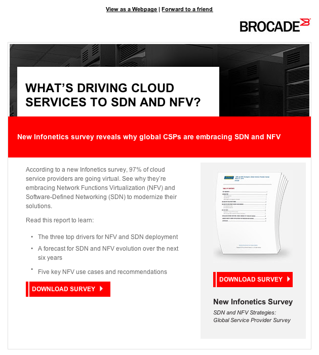 Brocade is a server manufacturer with a business/IT audience, so their strategy was to create top-of-funnel content to entice prospective buyers into their sales funnel. One of the conundrums with B2B marketing content, however, is how to create relevant, interesting content that’s also approachable and human — looking beyond the job title and into the real person behind the screen. I worked closely with the Brocade client to create sales-forward yet on-brand and provocative email content to elevate their engagement rates and generate MQLs.
