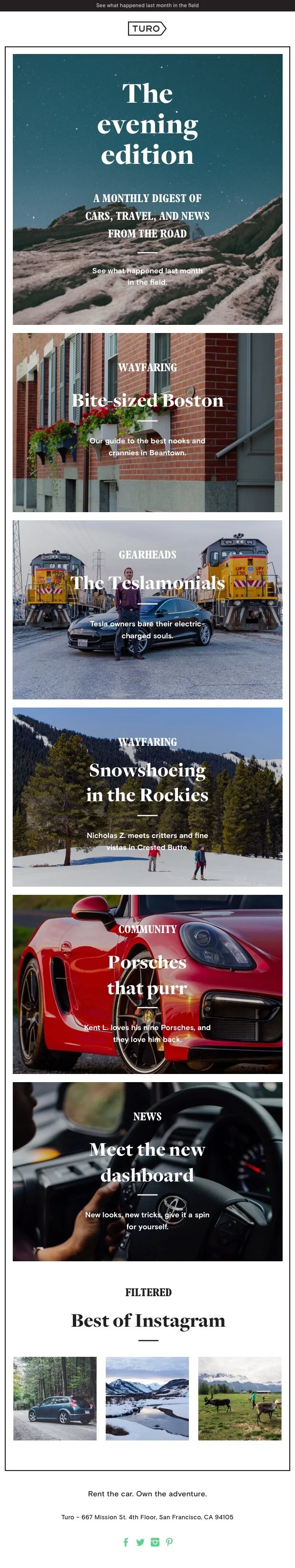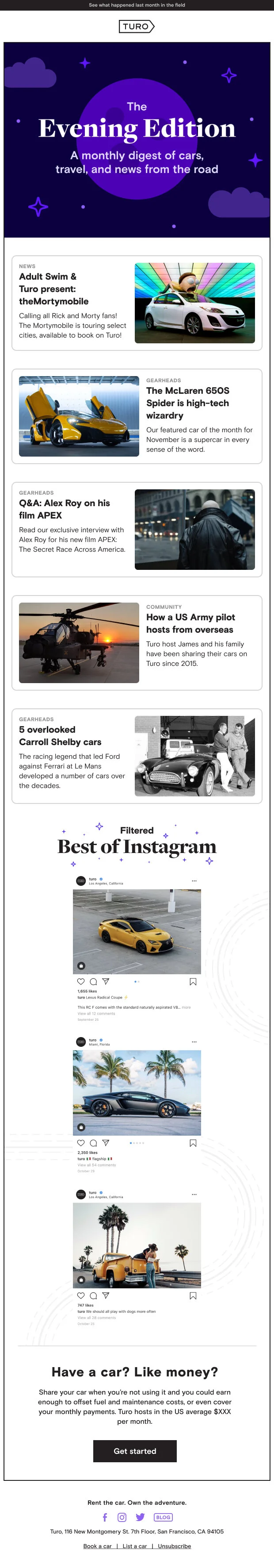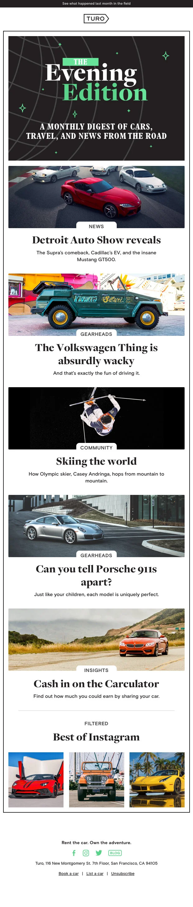 A monthly content digest aimed at building brand affinity and user engagement, the so-called “Evening edition” launches monthly late in the afternoon, targeting optimized email send times. It often curates auto-related content for the gearhead audience, while also amplifying any brand campaigns and community stories to humanize the marketplace.