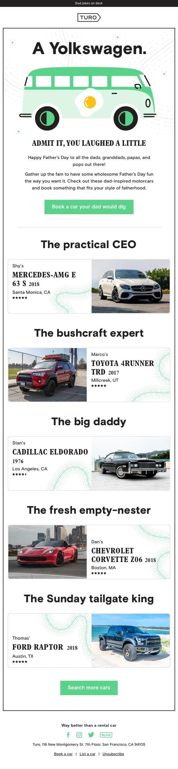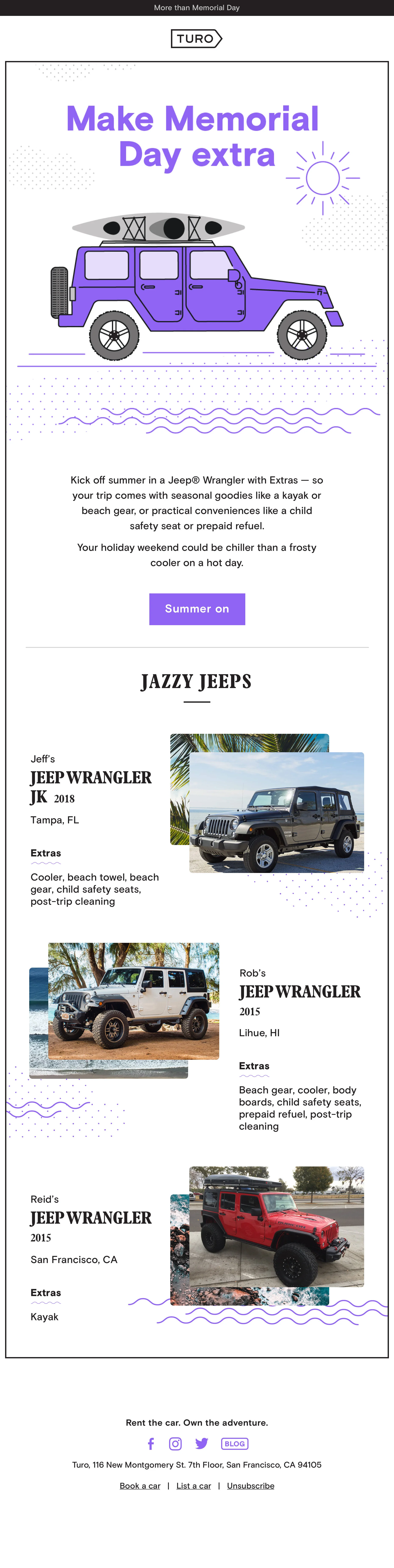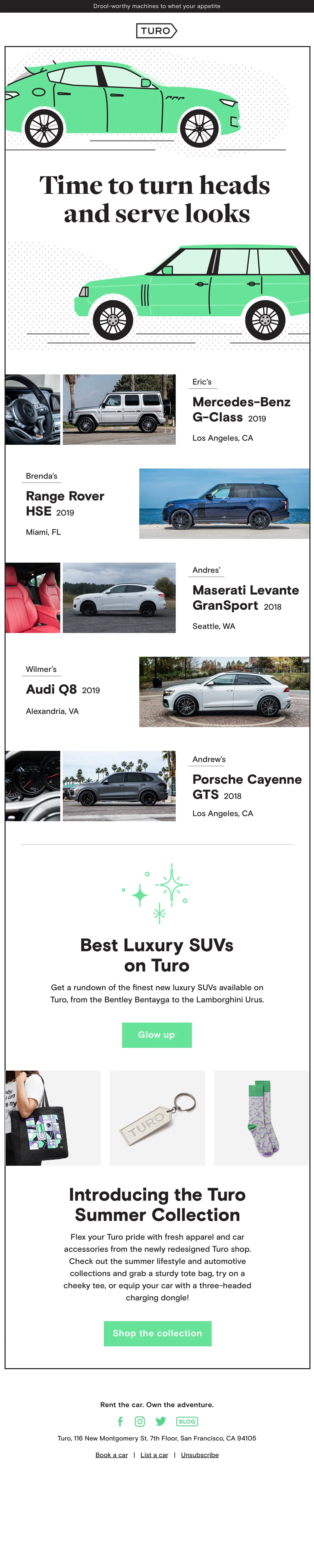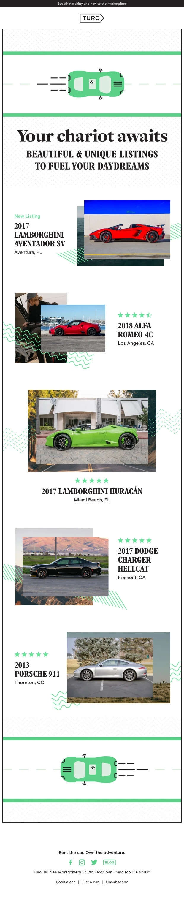 To stay top of mind in people’s inboxes, we regularly create one to three “seasonal” email campaigns per month, where we curate thematic inventory with clever seasonal messaging. Since Turo is effectively a travel company that surges on holidays, leaning on cultural travel moments, or creating our own travel moments by inspiring adventure, empowers the brand to delight our audience, stay relevant, and continually drive demand.