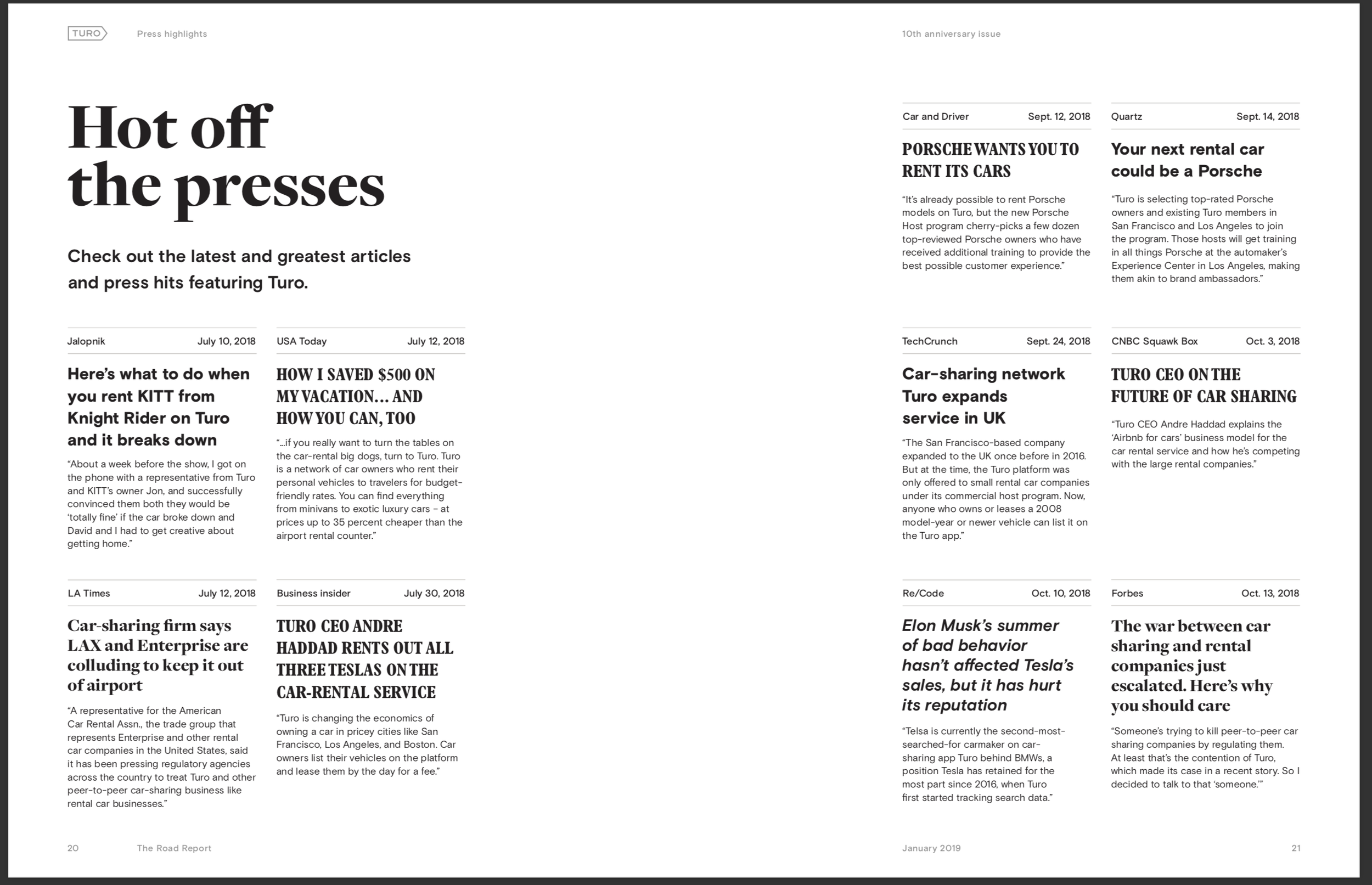 It started as a quarterly magazine, but as scope ballooned and resources became constrained, we transitioned to a bi-annual affair. It became one of the more anticipated aspects of our all-employee-conferences, and helped build the Turo culture into what it is today. Below are some of the more benign pages — so as to honor the company and employee’s privacy — from the tenth issue of the Road Report.
